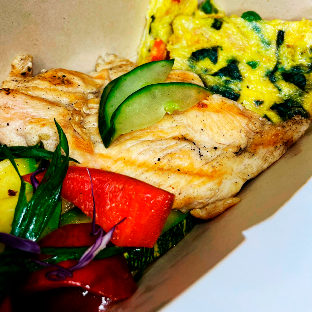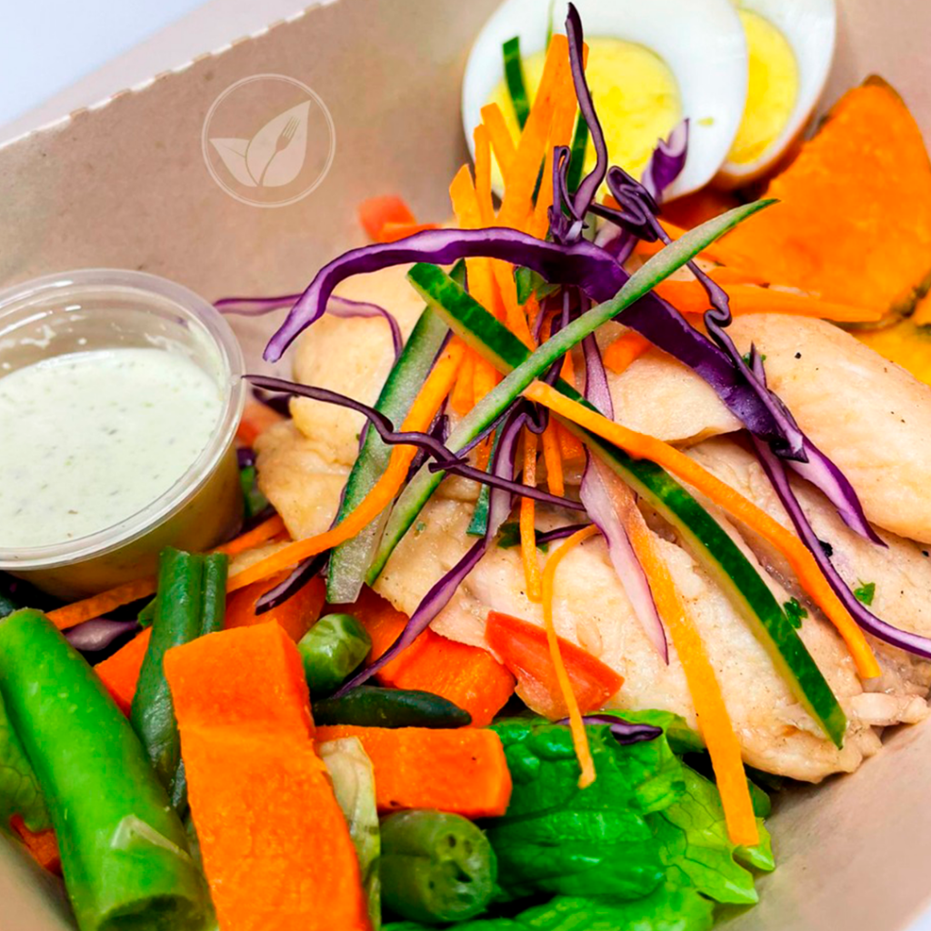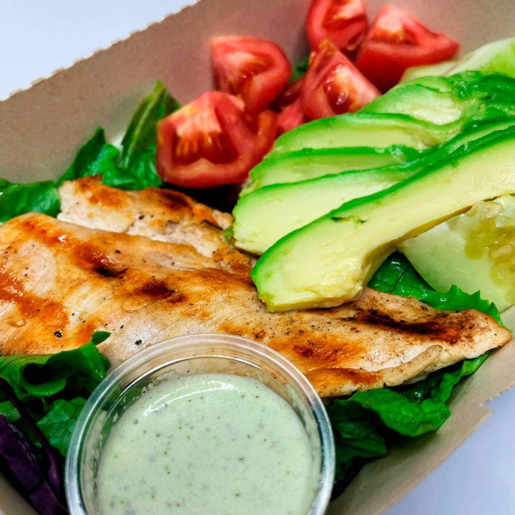 Ensalada a base de cinco toppings de verdura y proteína. Servido en envase biodegradable.